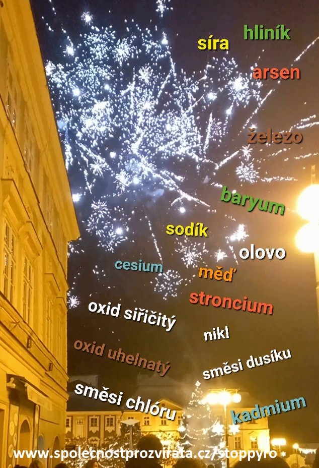 Pyrotechnika kontaminuje prostředí, ovzduší, vodu, půdu, zeleň, zahrady, plodiny. Střelný prach, výbušné směsi aj. chemikálie. Spad, prachové částice pokryjí místo, putují větrem. Jedovaté mraky obsahují: síru, chlór, draslík, baryum, hořčík, stroncium, měď, olovo, cín, hliník, fluor, křemík, kobalt, nikl, arsen, bróm, rubidium, oxidy síry, sírany kyseliny sírové, dusičnany, fluorovodík, oxid uhličitý a uhelnatý. Dráždí, leptají a pálí kůži, sliznice, oči, poškozují dýchací cesty a plíce, vnitřní orgány, pronikají do krve.