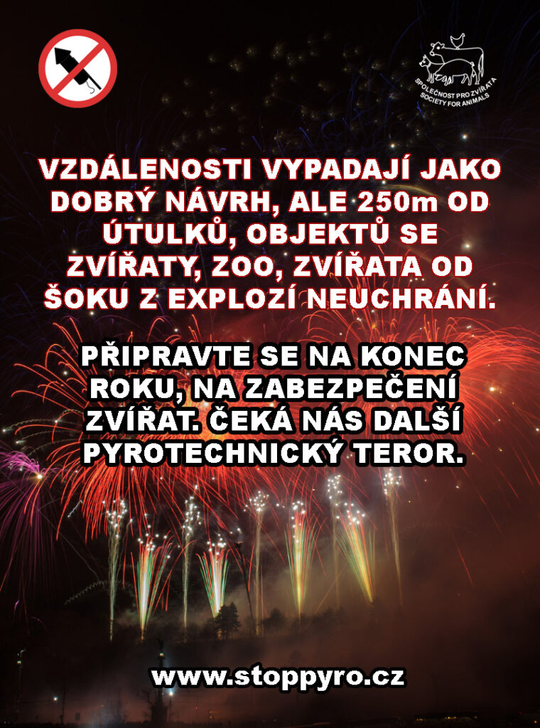 Doplnění: Při odpalování pyrotechniky venku dochází k porušování mnoha zákonů, např. zákon o ochraně zvířat proti týrání, zákon o ochraně přírody a krajiny, zákon o myslivosti. Více uvádíme v dolní polovině stránky: www.spolecnostprozvirata.cz/stoppyro